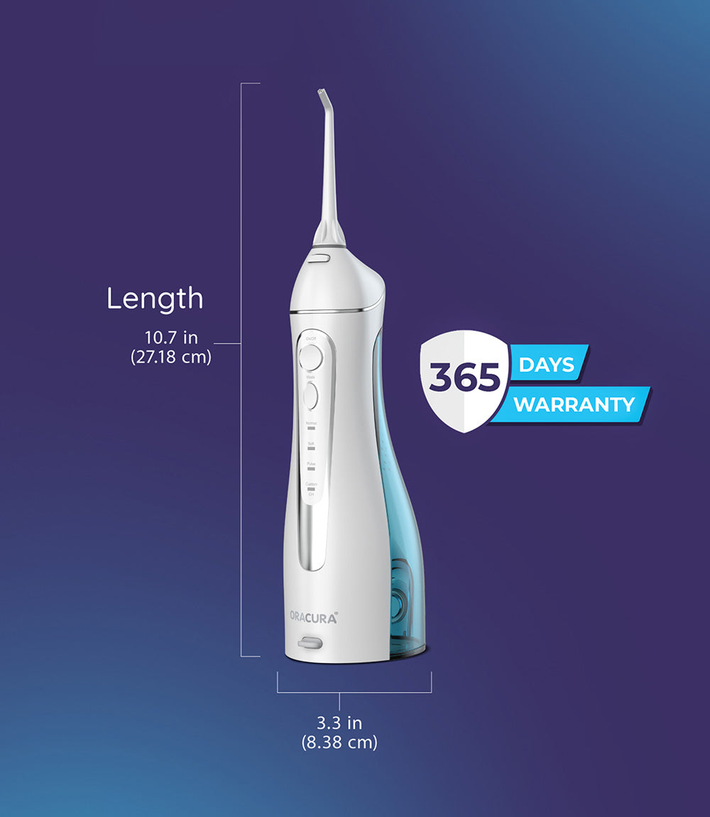 ORACURA® Smart Plus Water Flosser® OC200 LITE is 5x more effective in removing plaque. Its 4 modes of flossing and 8 adjustable pressure setting control ensures a professional-like cleanse with every use.